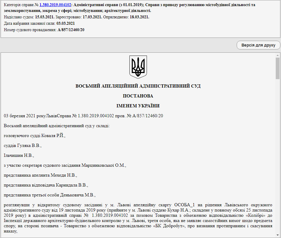 Восьмий апеляційний адміністративний суд скасував рішення попередньої інстанції про протиправність анулювання дозволу на будівельні роботи ТОВ «Колібрі». Йдеться про вже збудований житловий комплекс на вул. Замарстинівській, 162-164 – вул. Міртова, 7.
