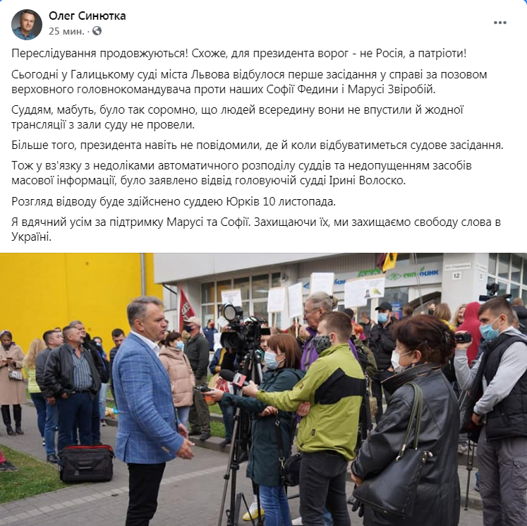 «Переслідування продовжуються! Схоже, для президента ворог – не Росія, а патріоти! Сьогодні у Галицькому суді міста Львова відбулося перше засідання у справі за позовом верховного головнокомандувача проти наших Софії Федини і Марусі Звіробій. Суддям, мабуть, було так соромно, що людей всередину вони не впустили й жодної трансляції з зали суду не провели. Більше того, президента навіть не повідомили, де й коли відбуватиметься судове засідання», – повідомив Олег Синютка.