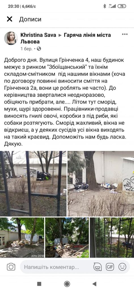 Як пише «Четверта студія», автор звернення закликає владу Львова і комунальників міста ще з березня минулого року навести лад на території прилеглій до Збоїщанського ринку та контролювати діяльність працівників ринку, які систематично «порушують санітарні норми».