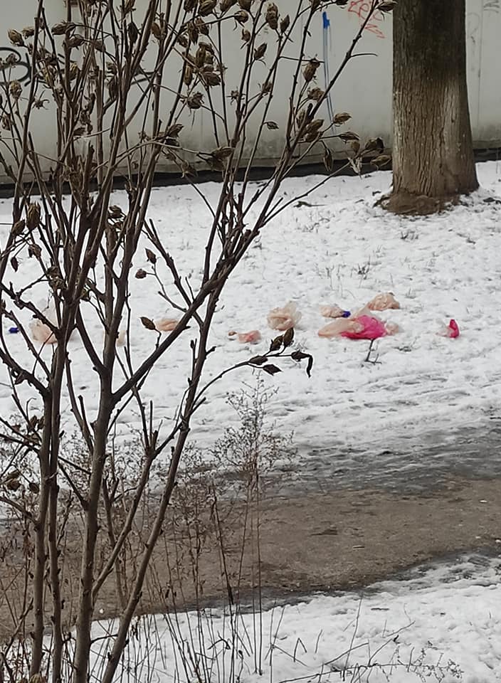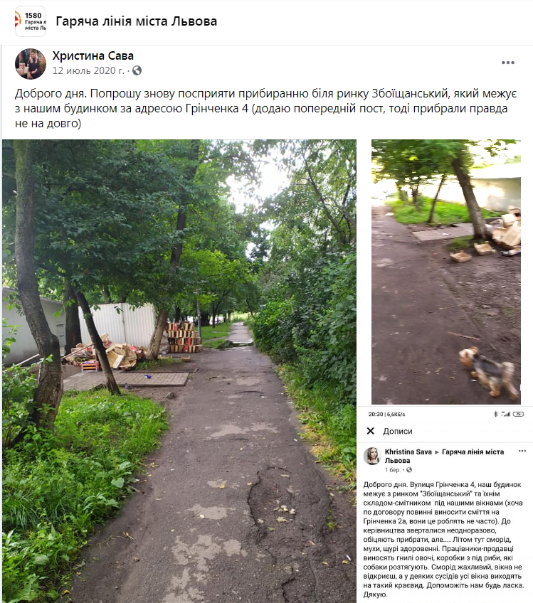 «Прошу повторно допомоги по дотриманню санітарних норм під нашими вікнами, які межують з ринком Збоїщанським, за адресою Грінченка, 4. На фото видно кульки чи то з м’ясного, чи то рибного товару. Собачки безпритульні порозтягували, сморід… Сподіваюся, що з ними все гаразд і вони не наїлися самого цього поліетилену. Додаю посилання на свій попередній допис…», – зазначає у зверненні на «Гарячу лінію міста Львова» у ФБ Христина Сава.