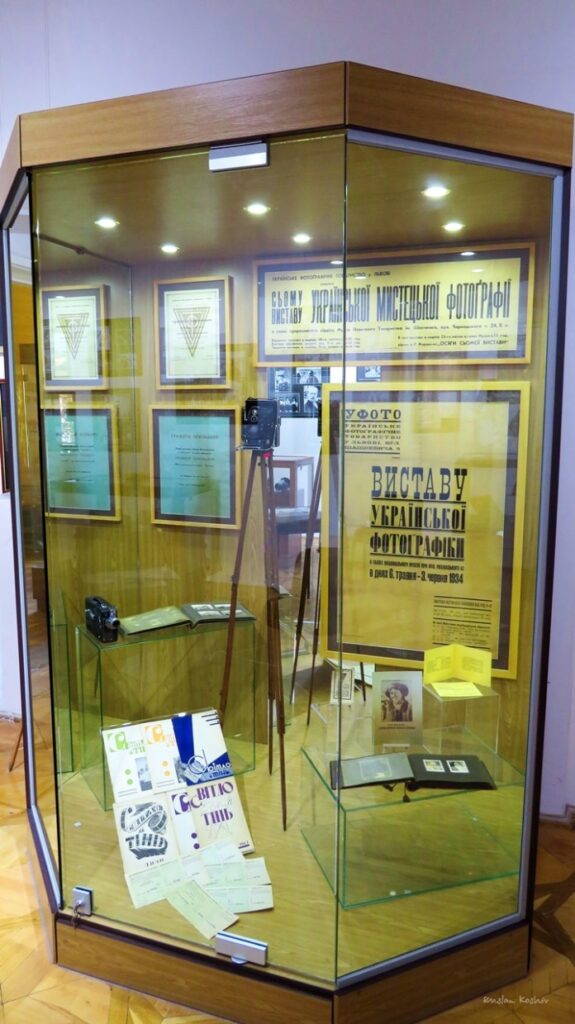 унікальні афіші фотографічних виставок, запрошення, квитки, фотоальбоми, випуски часопису «Світло й тінь». Серед раритетів — фото- та кінокамера одного зі