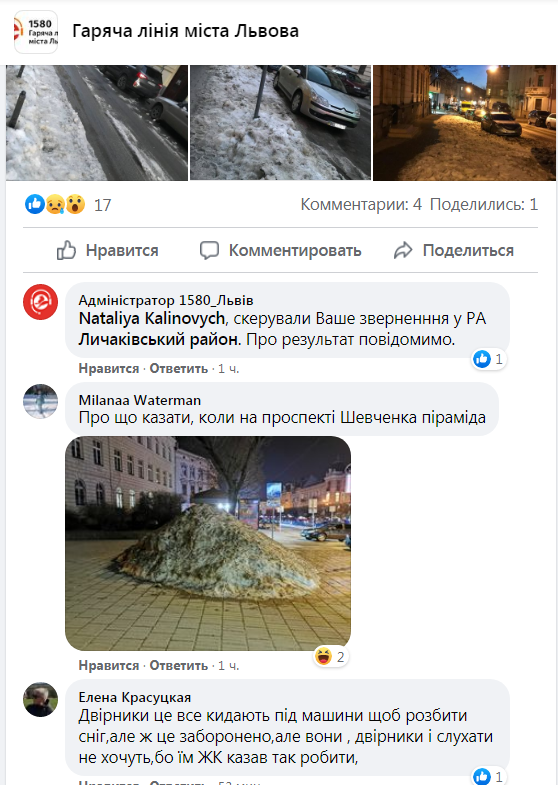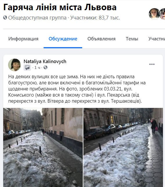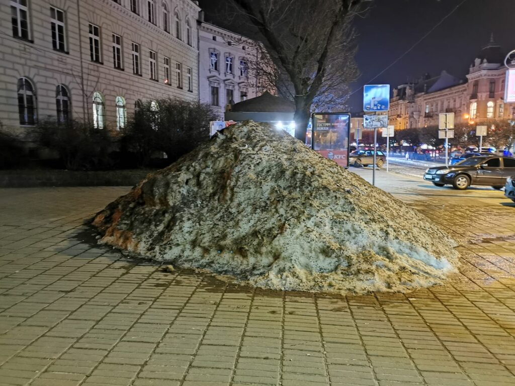 Як пише «Четверта студія», про це йдеться у зверненні на «Гарячу лінію міста Львова» Nataliya Kalinovych, яка оприлюднила світлини вулиць львова «завалених почорнілим снігом».