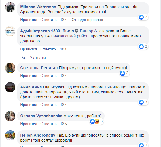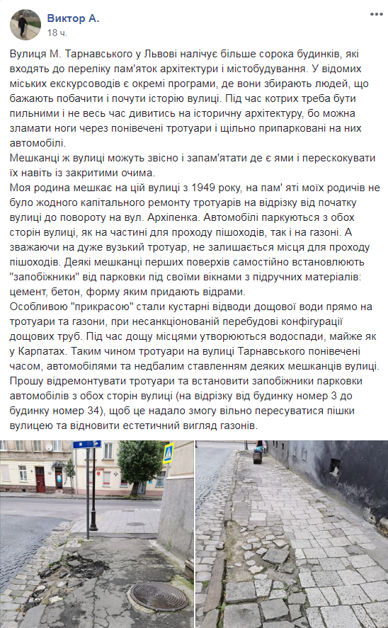 “Вулиця М. Тарнавського у Львові налічує більше сорока будинків, які входять до переліку пам’яток архітектури і містобудування. У відомих міських екскурсоводів є окремі програми, де вони збирають людей, що бажають побачити і почути історію вулиці. Під час котрих треба бути пильними і не весь час дивитись на історичну архітектуру, бо можна зламати ноги через понівечені тротуари і щільно припарковані на них автомобілі. Мешканці ж вулиці можуть звісно і запам’ятати де є ями і перескакувати їх навіть із закритими очима“, – зазначається у тексті звернення на “Гарячу лінію міста Львова”.