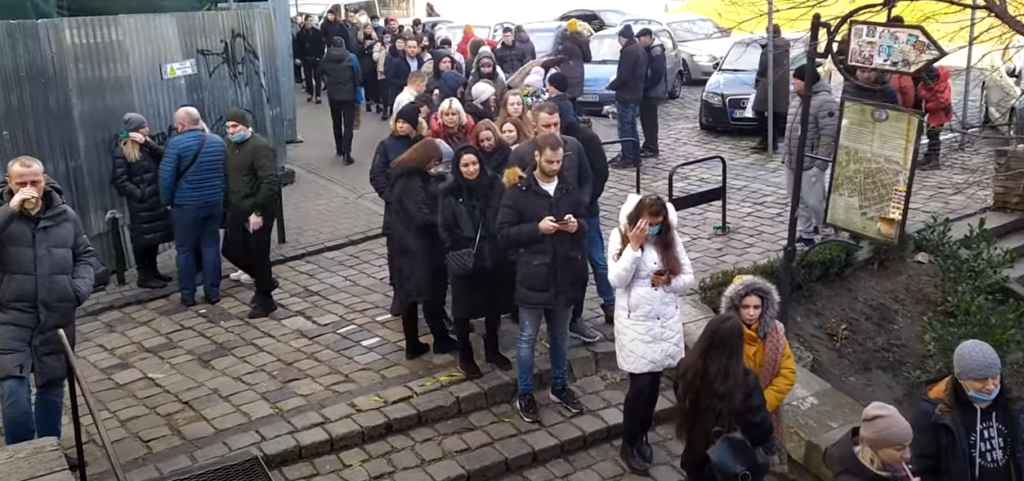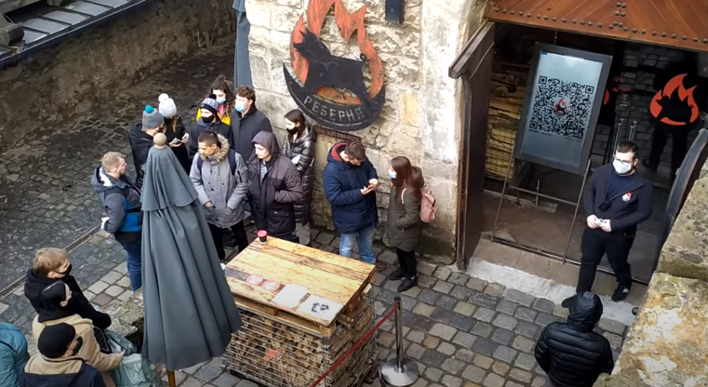 Як видно з відео, туристи готові стояти у черзі, аби поїсти ребер із крафтовим пивом у центрі Львова. Багато з них стоять без масок, дехто спустив маску під підборіддя.