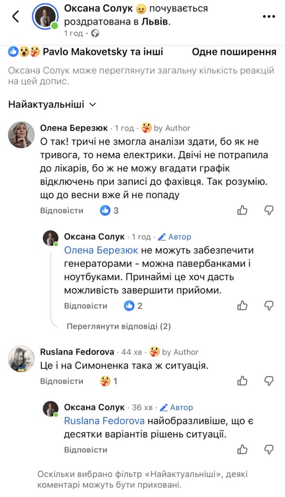 В період вимкнення – НІТ. Про генератори не чули. Зате вже енний раз проводять ремонтні роботи всередині за три роки в коридорах», – йдеться в повідомленні.