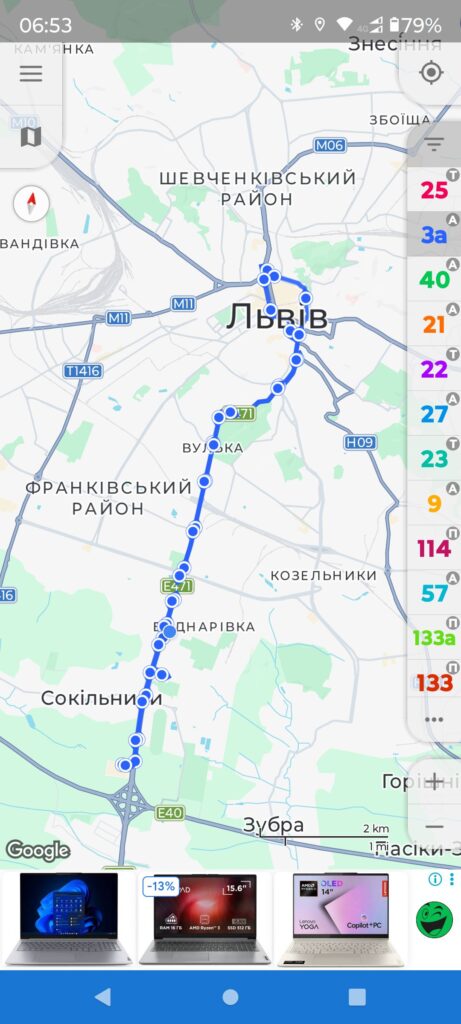 Маршрут обслуговувало 8 автобусів з інтервалом 15 хв. Перша відправка відбувається о 07:00 год з ТРЦ «King Cross Leopolis» та о 07:20 год з пл. Різні.