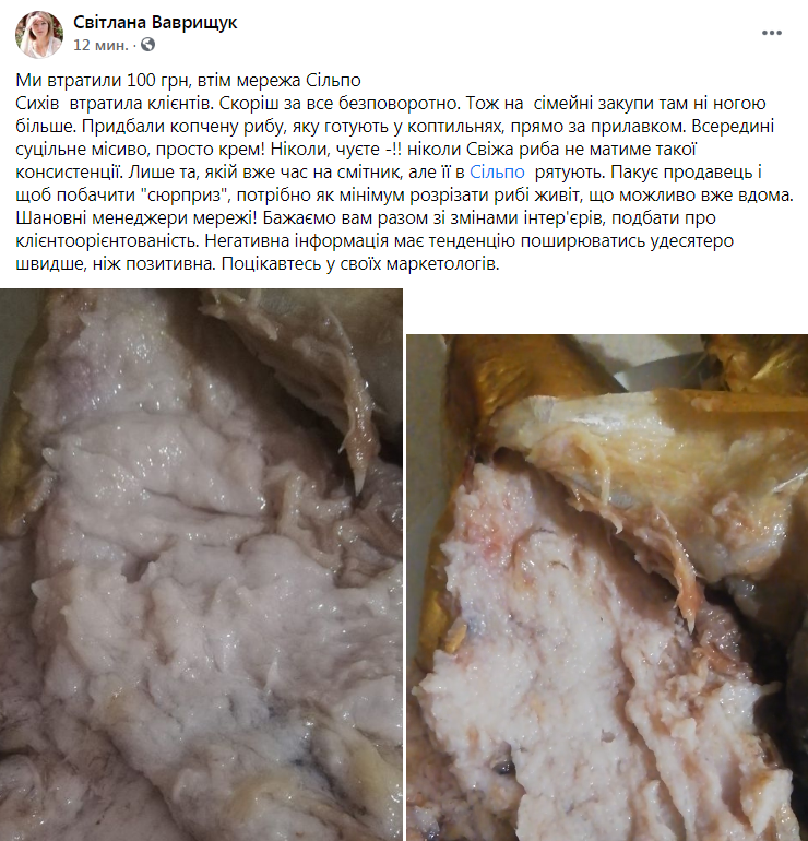 «Ми втратили 100 грн, втім мережа «Сільпо» Сихів втратила клієнтів. Скоріш за все безповоротно. Тож на сімейні закупи там ні ногою більше. Придбали копчену рибу, яку готують у коптильнях, прямо за прилавком. Всередині суцільне місиво, просто крем! Ніколи, чуєте – ніколи свіжа риба не матиме такої консистенції. Лише та, якій вже час на смітник, але її в “Сільпо” рятують. Пакує продавець і щоб побачити “сюрприз”, потрібно як мінімум розрізати рибі живіт, що можливо вже вдома.
