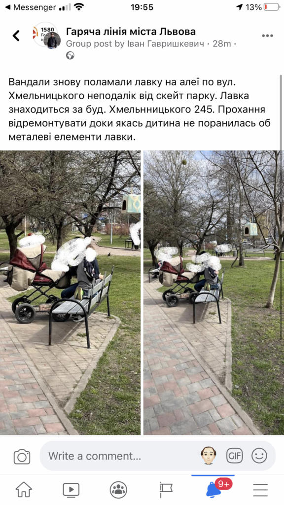 Львів’яни просять відремонтували лавки, доки “якась дитина не поранилась об металеві елементи лавки”.