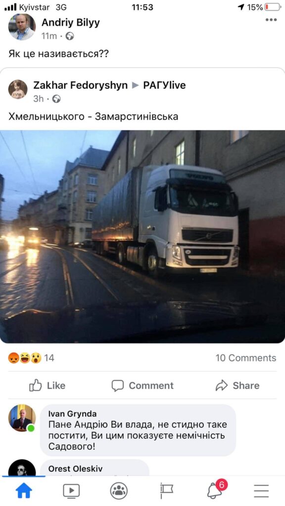 Натомість, у коментарі до перепосту А.Білого, Іван Гринда написав: «пане Андрію, ви влада, не соромно таке постити. Ви цим показуєте немічність Садового».