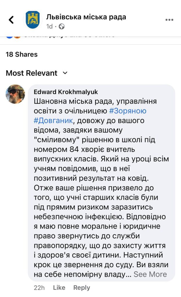 “Шановна міська рада, управління освіти з очільницею Зоряною Довганик, довожу до вашого відома, завдяки вашому “сміливому” рішенню в школі під номером 84 хворіє вчитель випускних класів. Який на уроці всім учням повідомив, що в неї позитивний результат на ковід.