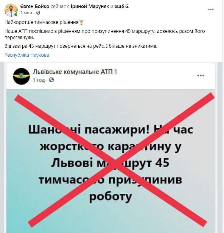 «Найкоротше тимчасове рішення. Наше АТП поспішило з рішенням про призупинення 45 маршруту, довелось разом його переглянули. Від завтра 45 маршрут повернеться на рейс. І більше не зникатиме», – повідомив на своїй сторінці Євген Бойко.
