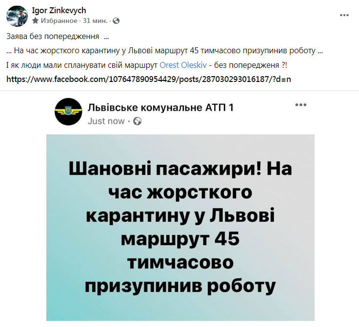 «Заява без попередження. На час жорсткого карантину у Львові маршрут 45 тимчасово призупинив роботу… І як люди мали спланувати свій маршрут без попередження ?!»,- зазначив у коментарі депутат Львівської міської ради Ігор Зінкевич.
