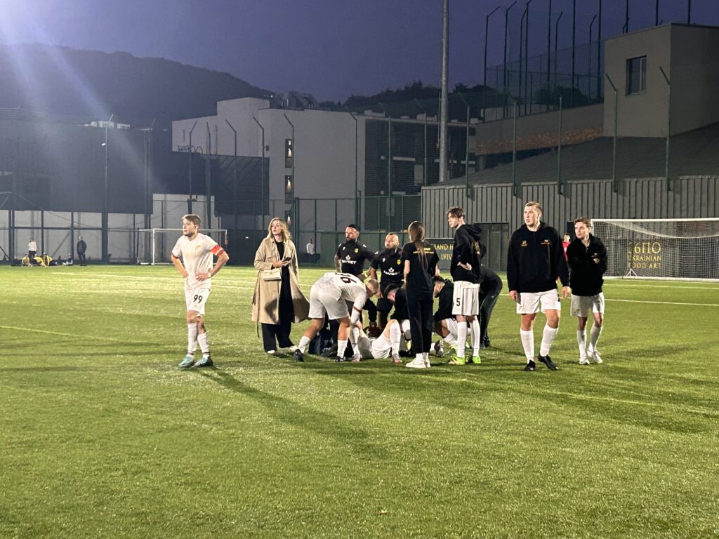 На 4 хвилині матчу Кордюк Євгеній впав на футбольному полі, оскільки його вдарив з ліктя Артем Сохацький. За що й отримав жовту карту.