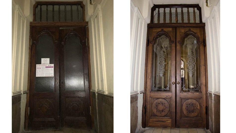 “Також ми провели заміну скла, яке було там не рідним і різне. Нанесли на нього малюнок із рослинним орнаментом. Це було необхідно для безпеки, адже якщо б скло було прозорим, його люди б не бачили, бо у під’їзді темно”, – каже реставратор Олександр Савчук.