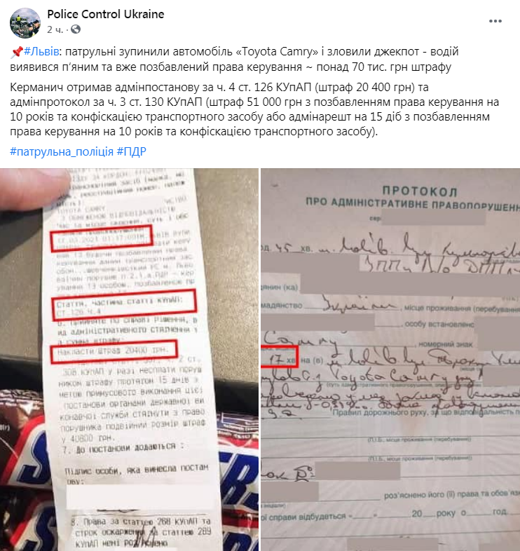 «Львів: патрульні зупинили автомобіль «Toyota Camry» і зловили джекпот – водій виявився п‘яним та вже позбавлений права керування – понад 70 тис. грн штрафу. Керманич отримав адмінпостанову за ч. 4 ст. 126 КУпАП (штраф 20 400 грн) та адмінпротокол за ч. 3 ст. 130 КУпАП (штраф 51 000 грн з позбавленням права керування на 10 років та конфіскацією транспортного засобу або адмінарешт на 15 діб з позбавленням права керування на 10 років та конфіскацією транспортного засобу)»,- зазначається у повідомленні Police Control Ukraine.