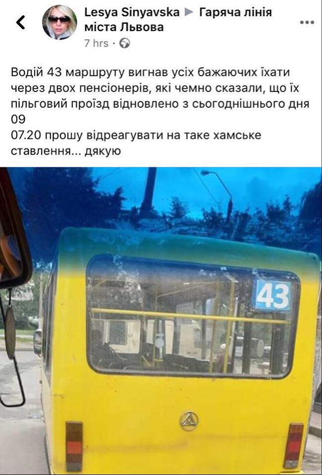 “Водій 43 маршруту вигнав усіх бажаючих їхати через двох пенсіонерів, які чемно сказали, що їх пільговий проїзд відновлено з сьогоднішнього дня. Прошу відреагувати на таке хамське ставлення”, – йдеться у дописі.