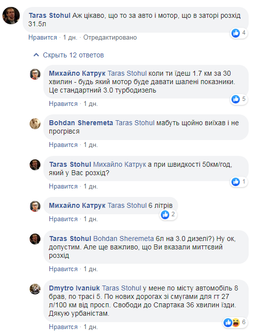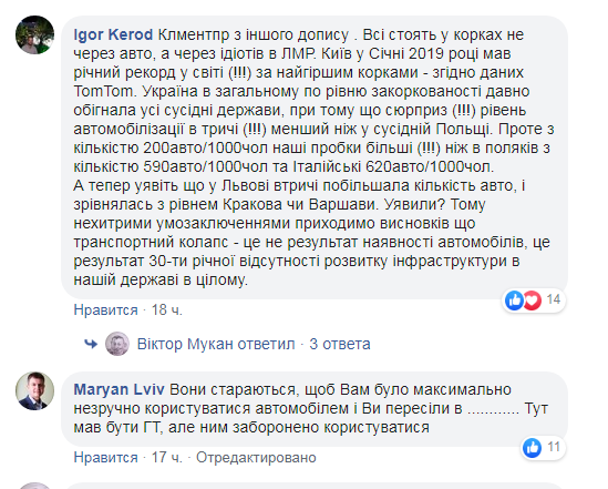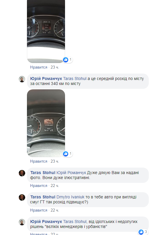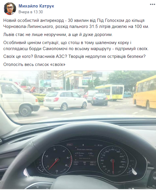 “Новий особистий антирекорд – 30 хвилин від Під Голоском до кільця Чорновола-Липинського, розхід пального 31.5 літрів дизелю на 100 км. Львів стає не лише незручним, а ще й дуже дорогим. Особливий цинізм ситуації, що стоїш в тому шаленому корку і споглядаєш борди Самопомочі по всьому маршруту – підтримуй своїх. Своїх це кого? Власників АЗС? Творців недолугих острівців безпеки? Оголосіть весь список «своїх», – зазначає у дописі Михайло Катрук на сторінці спільноти “Львів без заторів”.