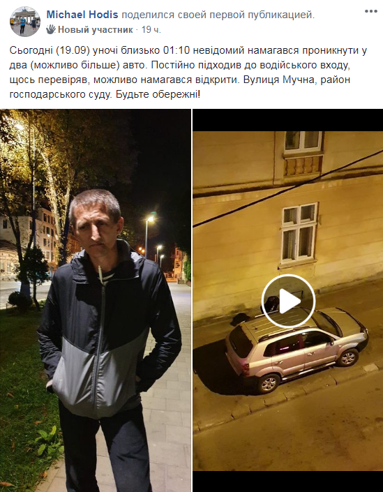 «19 вересня, уночі близько 01:10 невідомий намагався проникнути у два (можливо більше) авто. Постійно підходив до водійського входу, щось перевіряв, можливо намагався відкрити. Вулиця Мучна, район господарського суду. Будьте обережні!», – зазначається у дописі Michael Hodis, який оприлюднив відео з місця події.