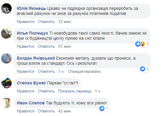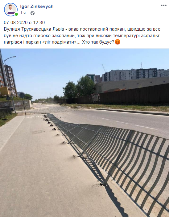 “07.08.2020 о 12:30. Вулиця Трускавецька, Львів. Впав поставлений паркан, швидше за все був не надто глибоко закопаний, тож при високій температурі асфальт нагрівся і паркан «ліг подрімати»… Хто так будує?”, – зазначається у коментарі до світлини з місця події.
