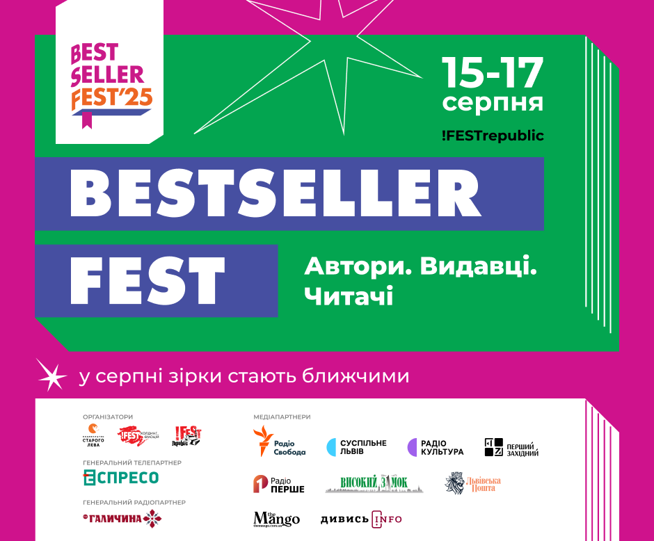 На три дні, від 15 до 17 серпня, Львів стане літературною столицею України. На території !FESTrepublic (вул. Старознесенська, 24-26) відбуватиметься новий всеукраїнський книжковий фестиваль BestsellerFest 2025. У програмі — 70 літературних подій за участі найвідоміших українських письменників, презентації новинок від провідних видавництв, а також – книжковий ярмарок на 50 стендів, ексклюзивні автограф-сесії, драйвові вечірні концерти просто неба, дитячий простір, фудкорти, зони відпочинку.