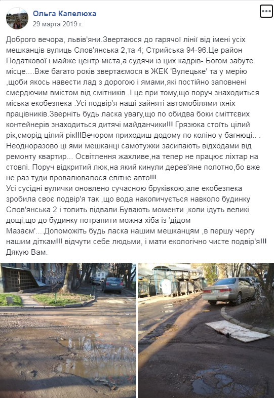 “Звертаюся до гарячої лінії від імені усіх мешканців вулиць Слов’янська 2, та 4; Стрийська 94-96. Це район Податкової і майже центр міста, а судячи із цих кадрів – Богом забуте місце….Вже багато років звертаємося в ЖЕК ‘Вулецьке’ та у мерію, щоб якось навести лад з дорогою і ямами, які постійно заповнені смердючим вмістом від смітників. І це при тому, що поруч знаходиться міська екобезпека. Усі подвір’я наші зайняті автомобілями їхніх працівників. Зверніть будь ласка увагу, що по обидва боки сміттєвих контейнерів знаходиться дитячі майданчики! Грязюка стоїть цілий рік, сморід цілий рік! Вечором приходиш додому по коліно у багнюці… Неодноразово ці ями мешканці самотужки засипають відходами від ремонту квартир… Освітлення жахливе. Поруч відкритий люк, на який кинули дерев’яне полотно,бо вже не раз туди провалювалося елітне авто! Усі сусідні вулички оновлено сучасною бруківкою, але екобезпека зробила своє подвір’я так, що вода накопичується навколо будинку Слов’янська, 2 і топить підвали. Бувають моменти, коли йдуть великі дощі, що до будинку потрапити можна хіба із ‘дідом Мазаєм’. Допоможіть мешканцям, в першу чергу нашим діткам, відчути себе людьми, і мати екологічно чисте подвір’я!“, – йдеться у тексті звернення на “Гарячу лінію міста Львова” у ФБ Ольги Капелюха 29 березня 2019 року.