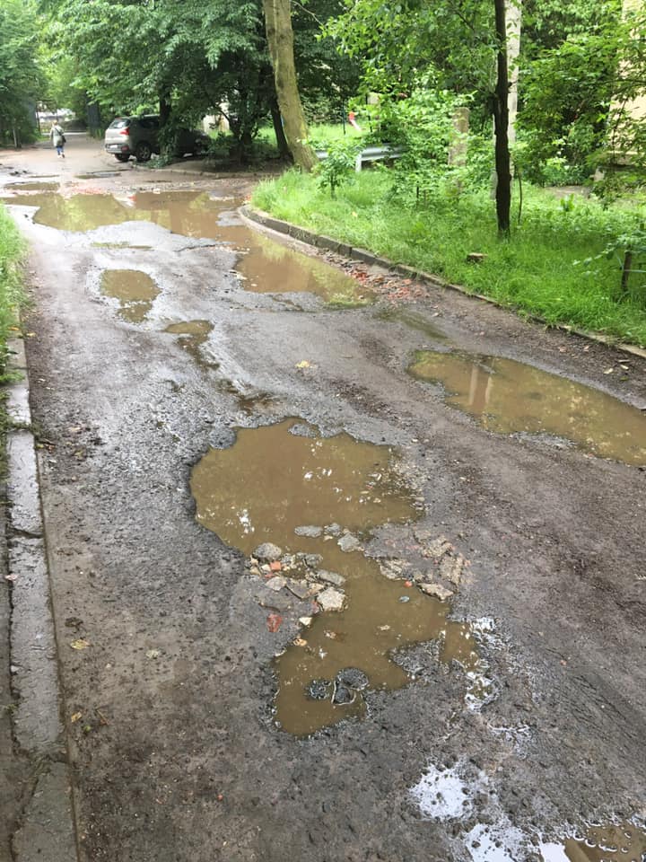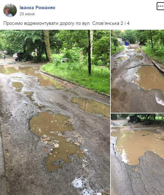 “Просимо відремонтувати дорогу по вул. Слов’янська, 2 і 4”, – зазначається у тексті звернення на “Гарячу лінію міста Львова” у ФБ Іванки Романяк у червні 2020 року.