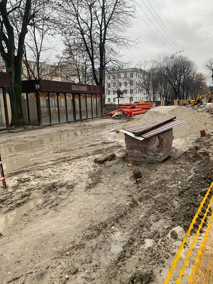 “Трішки «романтики» міських львівських реалій у стрічку. Пекарська. Гроші тонуть в болоті… дерева спиляли, але “МАФи” – вічні”, – написав Синютка.
