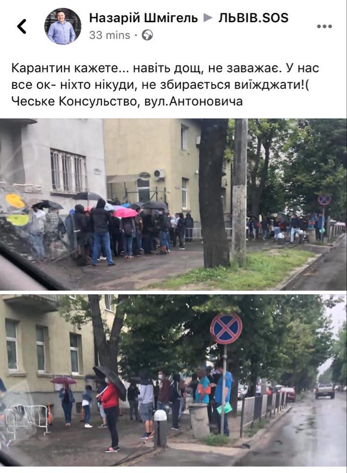 За його словами, на вулиці Антонича, 130А, попри карантин та дощову погоду, до посольства вишикувалась велика черга.