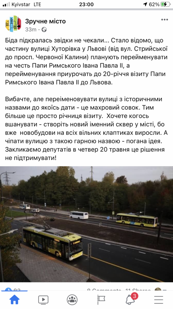 - У Львові виступили проти перейменування вулиці на честь Папи Римського Івана Павла ІІ, скрін повідомлення, Фото Зручне місто