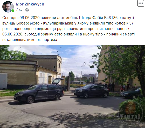 “У Львові сьогодні 06.06.2020 виявили автомобіль “Шкода Фабія” (Вс8136іе) на куті вулиць Боберського – Кульпарківськав у якому виявили тіло чоловік 37 років, попередньо відомо що рідні сповістили про зникнення чоловік 05.06.2020. Сьогодні зранку авто виявли і в ньому тіло – причини смерті встановлюватиме експертиза”,- повідомив Ігор Зінкевич.