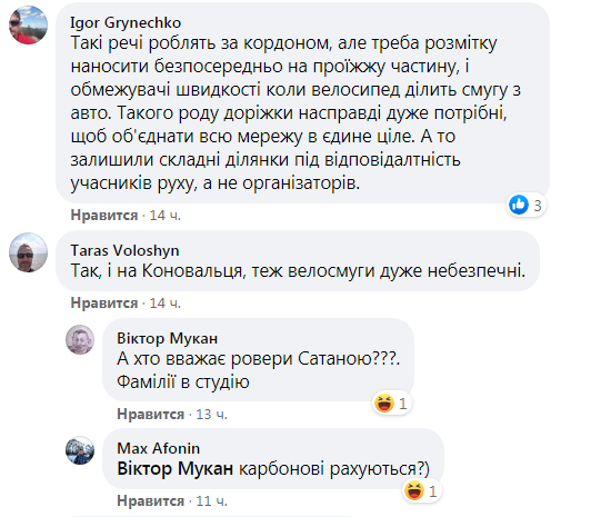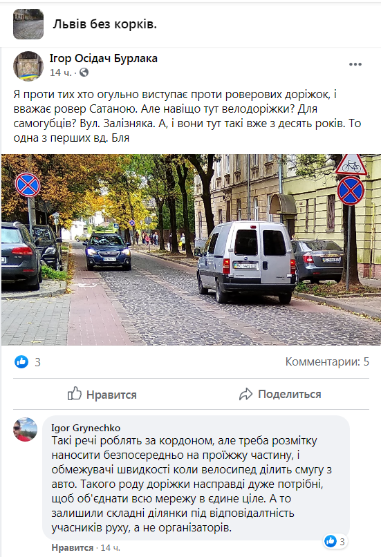 “Я проти тих хто огульно виступає проти роверових доріжок. Але навіщо тут велодоріжки? Для самогубців? Вул. Залізняка. А, і вони тут такі вже з десять років. То одна з перших велодоріжок”, – зазначив у своєму дописі Ігор Осідач Бурлака на сторінці спільноти “Львів без корків” у ФБ.