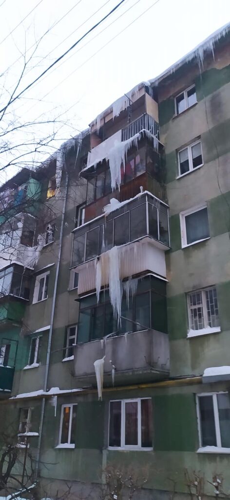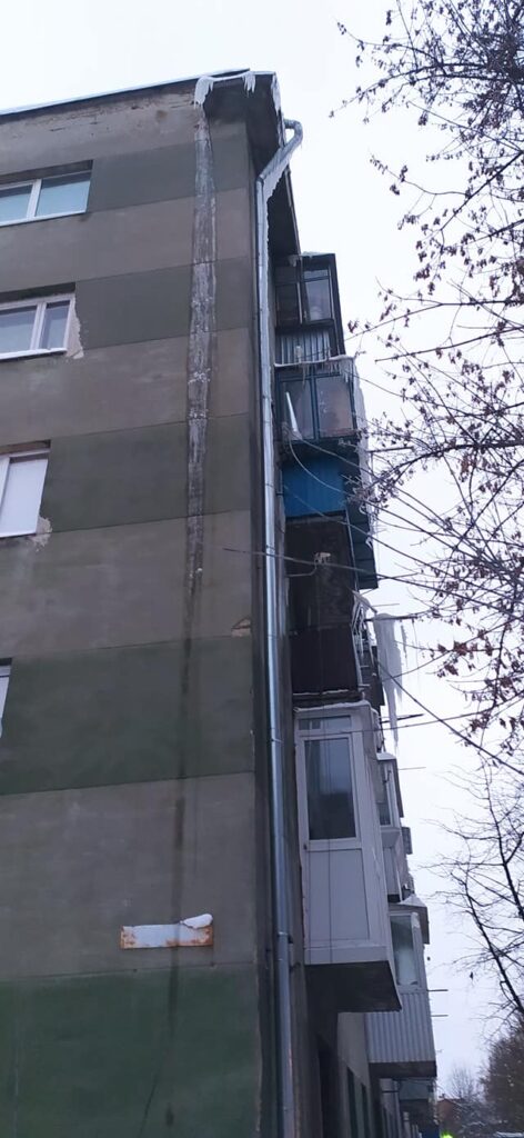 Мешканці будинку просять комунальні служби почистити ринву та дах від снігу.