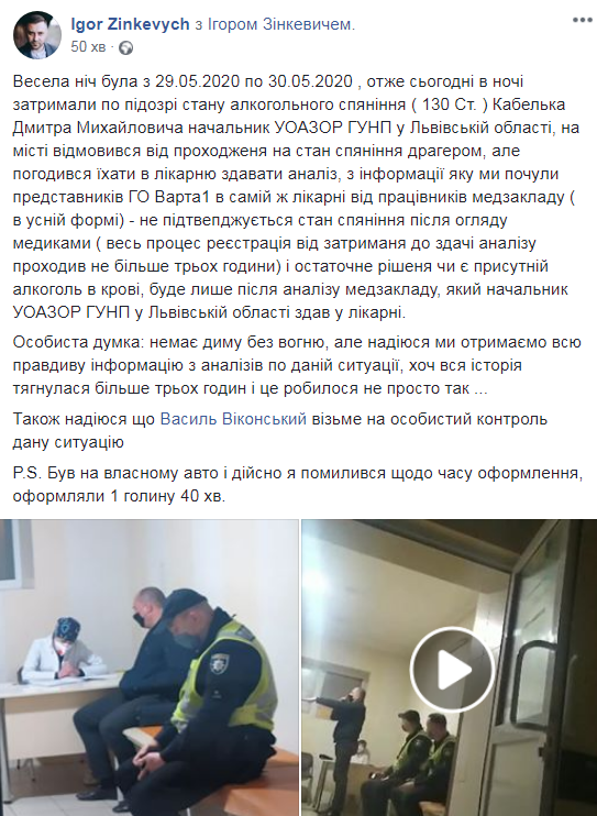 “Весела ніч була з 29.05.2020 по 30.05.2020 , отже сьогодні вночі затримали по підозрі стану алкогольного сп’яніння Кабелька Дмитра Михайловича начальник УОАЗОР ГУНП у Львівській області, на місті відмовився від проходження на стан спяніння драгером, але погодився їхати в лікарню здавати аналіз. З інформації яку ми почули представників ГО “Варта1″ в самій ж лікарні від працівників медзакладу (в усній формі) – не підтверджується стан сп’яніння після огляду медиками і остаточне рішення чи є присутній алкоголь в крові, буде лише після аналізу медзакладу, який начальник УОАЗОР ГУНП у Львівській області здав у лікарні”, – повідомив Зінкевич.