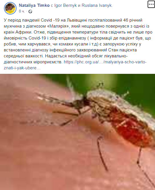 У період пандемії Covid -19, на Львівщині госпіталізований 46-річний мужчина з діагнозом «малярія», який нещодавно повернувся із однієї із країн Африки.