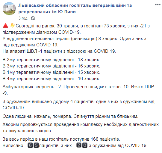 Сьогодні на ранок, 30 травня, в госпіталі 73 хворих, з них – 21 з підтвердженим діагнозом COVID-19.