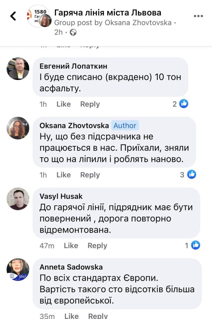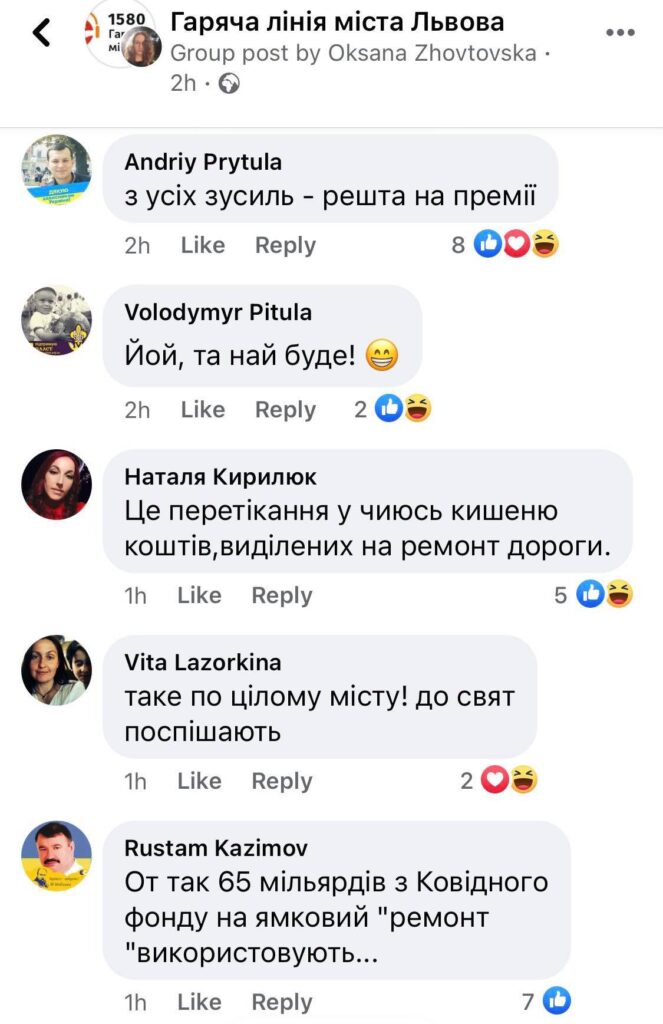 Під дописом Andriy Prytula зазначив, що заасфальтували лише пів ями, бо решту бюджету скерували на премії.