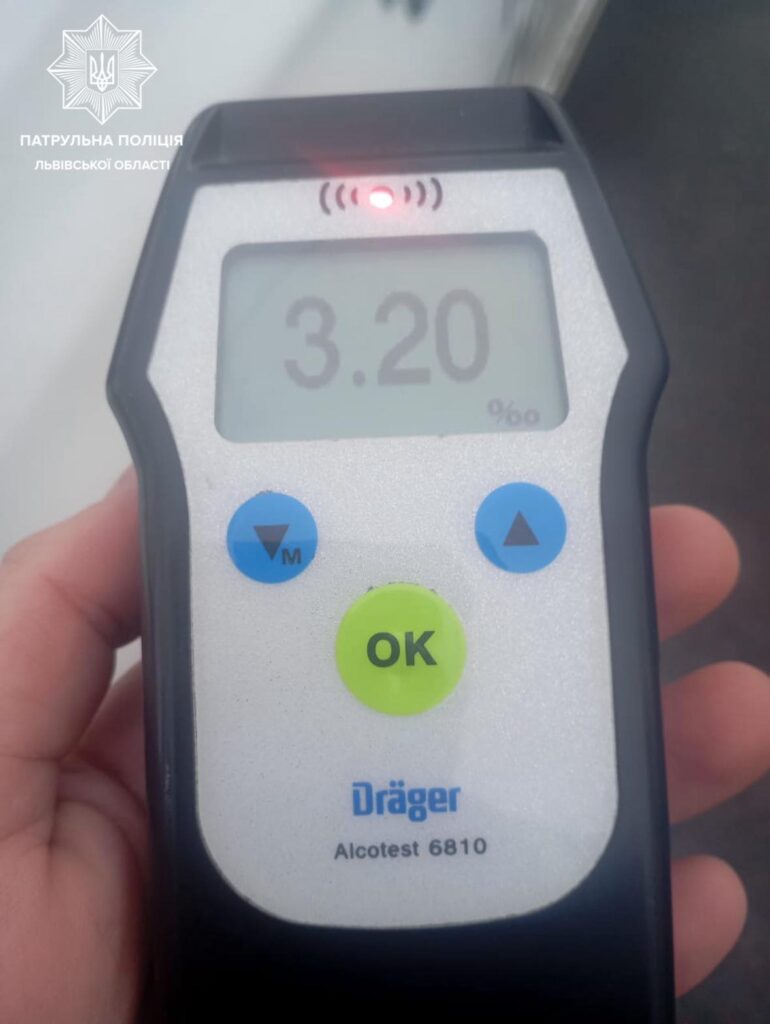 Під час спілкування із порушником, поліцейські помітили у нього ознаки сильного алкогольного спʼяніння. Перевірка на пристрої Драгер показала результат — 3,20 проміле.