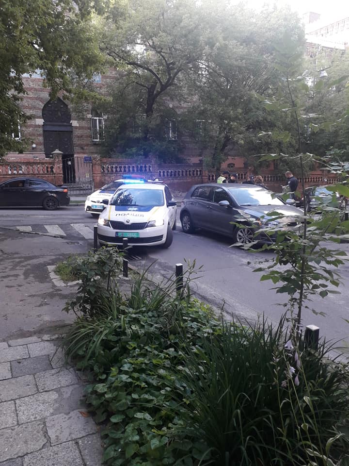 Як повідомляється, на вулиці Леонтовича жінка-водій розгубилась перед червоними “мегалками”, і в’їхала у автомобіль поліції.