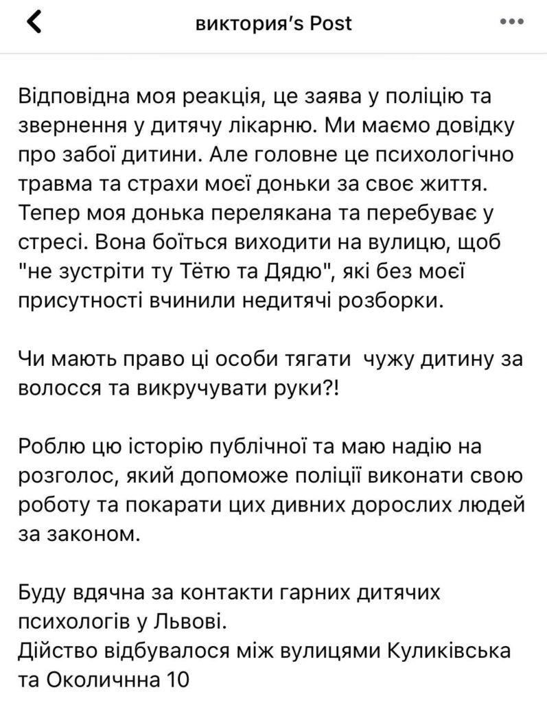 “Відповідна моя реакція – це заява у поліцію та звернення у дитячу лікарню. Ми маємо довідку про забої дитини. Але головне – це психологічна травма та страхи моєї доньки за своє життя. Тепер моя донька перелякана та перебуває у стресі. Вона боїться виходити на вулицю, щоб “не зустріти ту Тётю та Дядю”, які без моєї присутності вчинили недитячі розборки”, – розповідає мати потерпілої дівчинки.