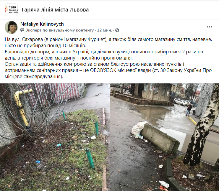 «Відповідно до норм, діючих в Україні, ця ділянка вулиці повинна прибиратися 2 рази на день, а територія біля магазину – постійно протягом дня. Організація та здійснення контролю за станом благоустрою населених пунктів і дотриманням санітарних правил – це обов’язково місцевої влади (ст. 30 Закону України Про місцеве самоврядування)!», – наголошується у зверненні Nataliya Kalinovych на «Гарячу лінію міста Львова».