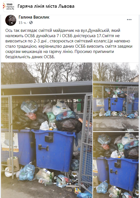 «Ось так виглядає сміттєвий майданчик на вул. Дунайській, який належить ОСББ Дунайська, 7 і ОСББ Дністерська, 17.Сміття не вивозиться по 2-3 дні, створюється сміттєвий колапс. Це, напевно, стало традицією, керівництво даних ОСББ вивозить сміття завдяки скаргам мешканців на Гарячу лінію. Просимо припинити бездіяльність даних ОСББ»,- зазначає у зверненні на Гарячу лінію міста Львова у ФБ Галина Василик.