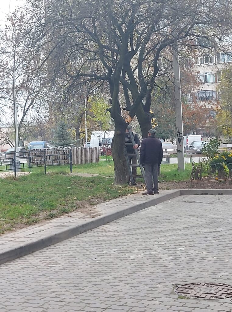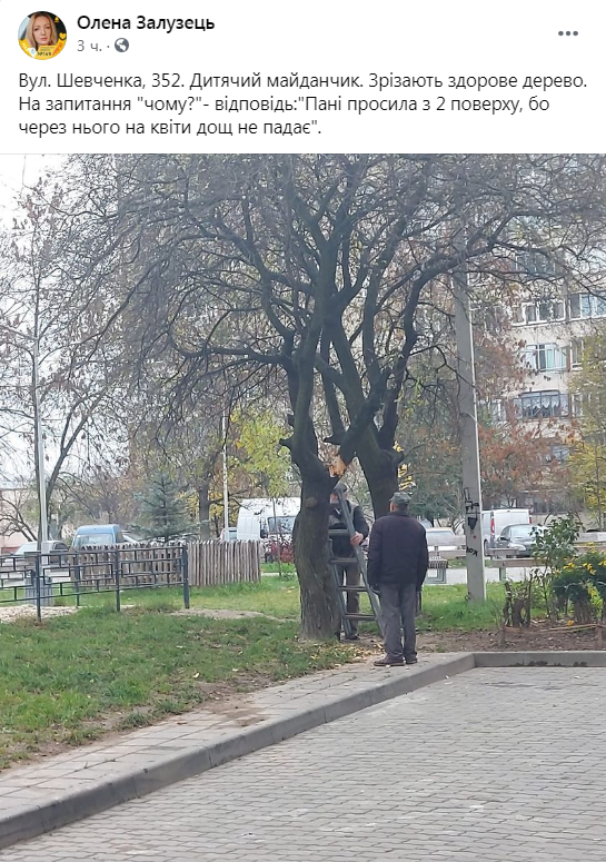 «Вул. Шевченка, 352. Дитячий майданчик. Зрізають здорове дерево. На запитання “чому?” – відповідь:”пані просила з 2 поверху, бо через нього на квіти дощ не падає”, – зазначається у зверненні Олена Залузець на «Гарячу лінію міста Львова», яка оприлюднила світлини з місця події.