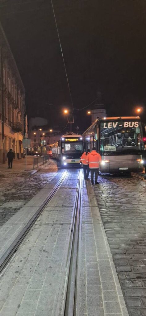 Вул. Городоцька в сторону центру стоїть, рух трамваїв призупинено