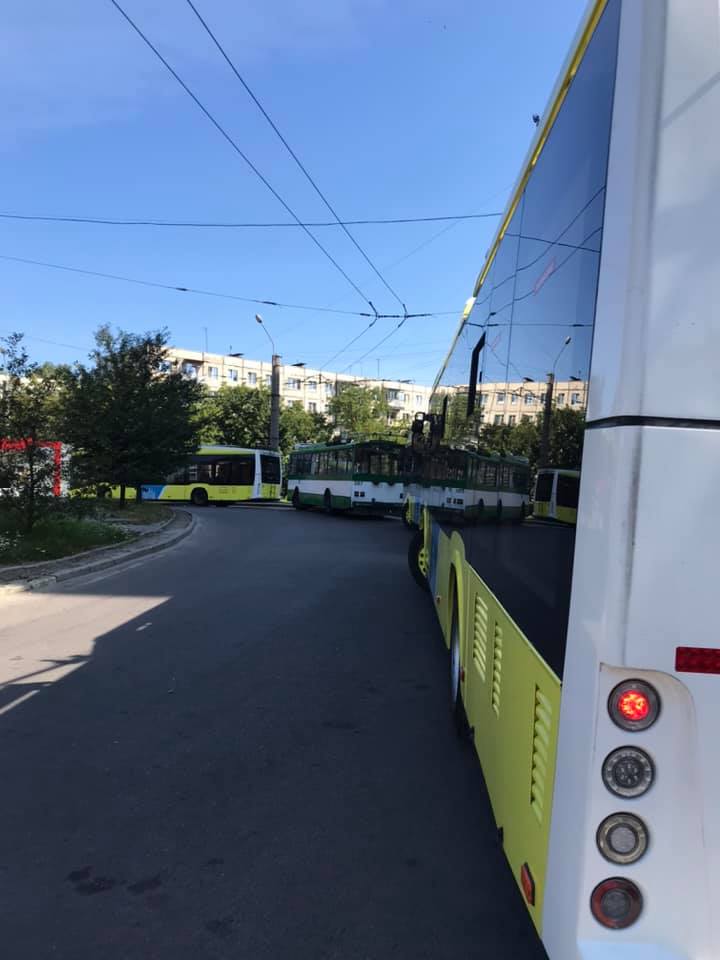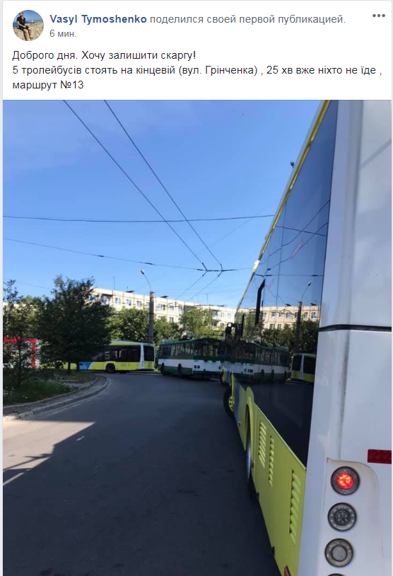 “Хочу залишити скаргу. 5 тролейбусів стоять на кінцевій (вул. Грінченка) , 25 хв вже ніхто не їде , маршрут №13”,- зазначається у тексті звернення на “Гарячу лінію міста Львова” під світлинами з місця події.