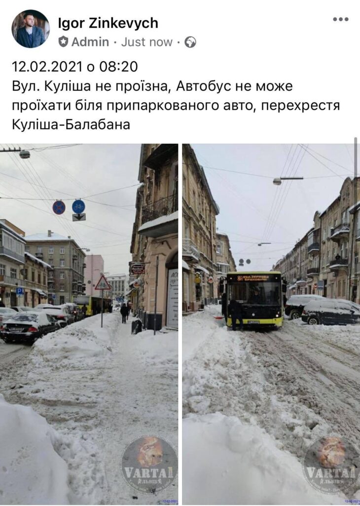 “Вулиця Куліша не проїзна. Автобус не може проїхати біля припаркованого авто поблизу перехрестя Куліша-Балабана”, – йдеться у повідомленні.