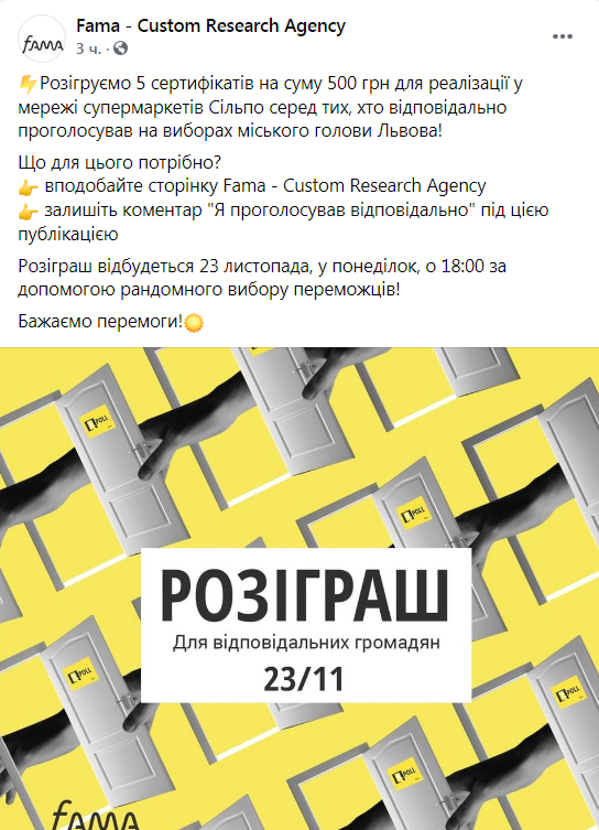 Нам стало відомо, що в соціальних мережах, а також у друкованому вигляді біля дільниць, та, за деякими повідомленнями, на самих дільницях розповсюджується інформація про розіграш призів, що проводиться соціологічною агенцією «Фама» серед осіб, що взяли участь у голосуванні 22 листопада 2020 року на повторних виборах Львівського міського голови та виконали відповідні умови.