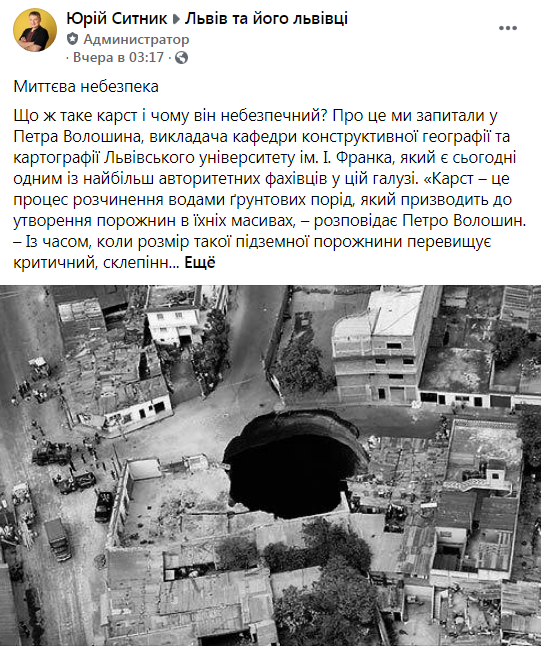 Міській владі вигідно замовчувати карстову небезпеку у Львові