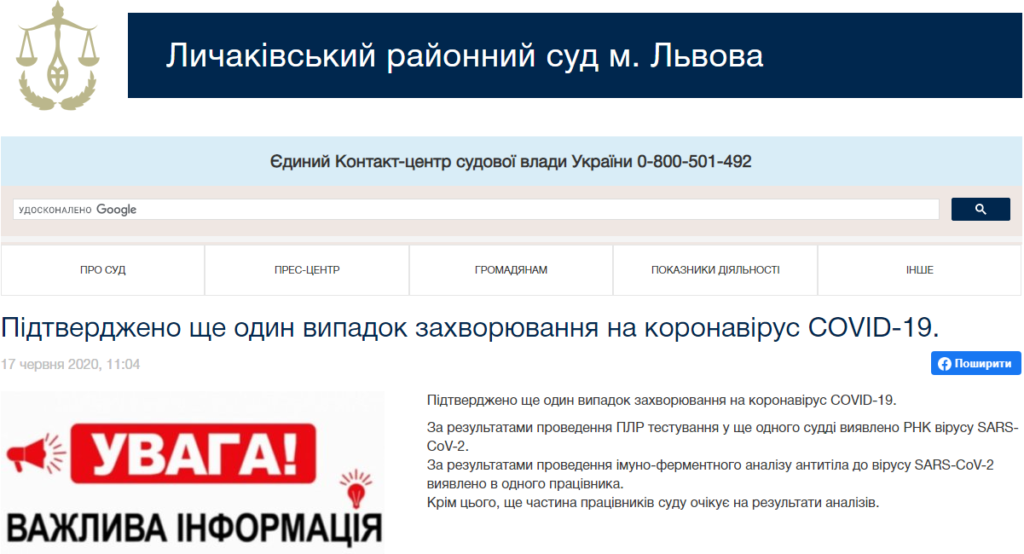 Як повідомлялося, у судді Личаківського районного суду міста Львова підтвердили коронавірус. 09.06.2020, роботу суду було тимчасово зупинено з метою проведення дезінфекції приміщення.