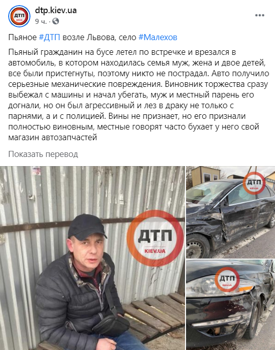 “Винуватець події відразу вибіг з машини і почав тікати, чоловік і місцевий хлопець його наздогнали, але він був агресивний і ліз у бійку не тільки з хлопцями, а й з поліцією. Провини не визнає, але його визнали повністю винним, місцеві кажуть часто бухає у нього свій магазин автозапчастин “, – зазначається у повідомленні на сторінці dtp.kiev.ua у ФБ.