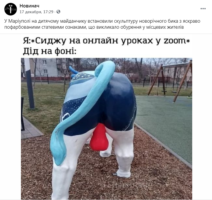 У Маріуполі на дитячому майданчику встановили скульптуру новорічного бика з яскраво пофарбованими статевими ознаками, що викликало обурення у місцевих жителів.